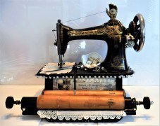 My grandmother’s broken ironstone china cup is featured on the bed of the sewing machine. The Tea Leaf pattern of the cup dates it to some time in the mid-19th to early 20th century. The broken cup holds an assortment of old buttons. Trinkets bearing company names used to be distributed as corporate advertising and the thimble beside the cup bears the name “Prudential” to advertise the life insurance company. Completing the piece are other sewing tools and a brass heart trinket. Scissors, made by Singer, are held in place by the typewriter carriage strap. A tatting shuttle, used in making lace, rests nearby.