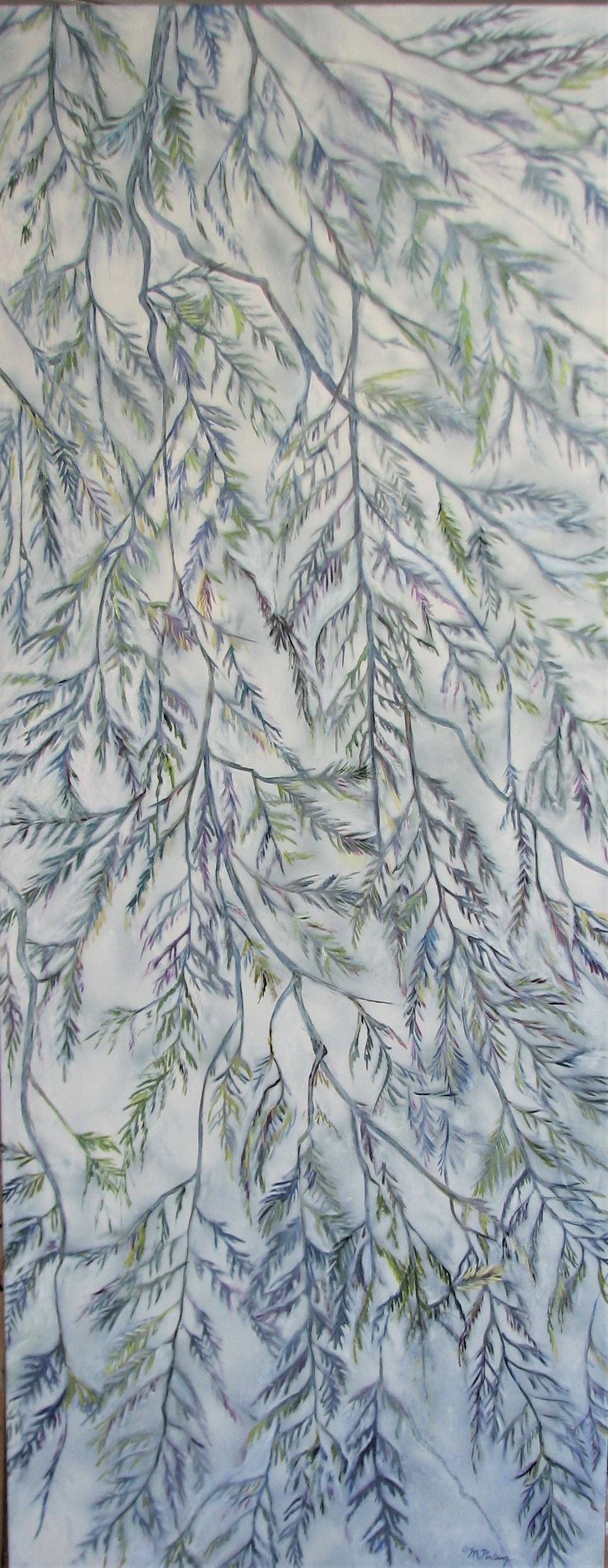 During the winter when the fog rolls off the Salish Sea into my neighbourhood, a heavy mist forms a backdrop to the tall cedar in my back yard. This painting is inspired by that scene and by all the gorgeous cedars that are ubiquitous on Vancouver Island.