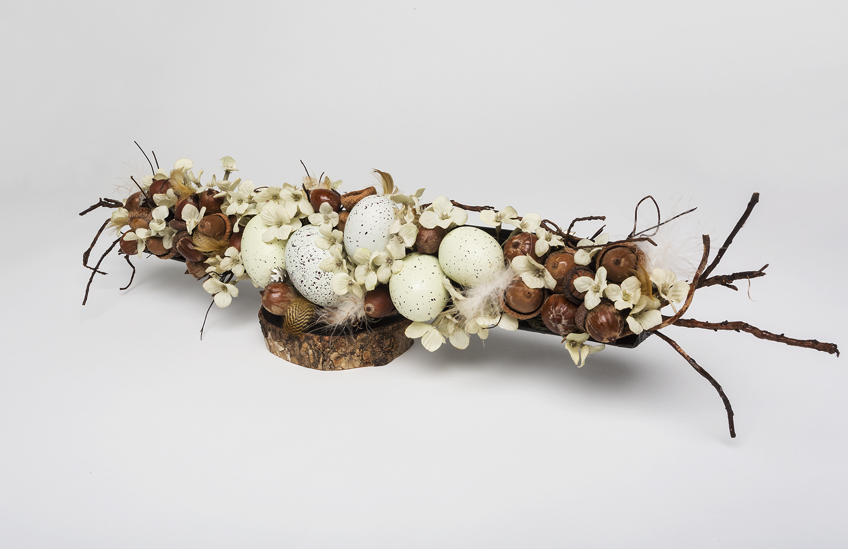 This assemblage focuses on spring, the time of renewal, and autumn, the harvest season. The piece features numerous organic forms, including branches, roots, eggs, feathers, acorns, oak leaf pins, and flowers of an hydrangea. Throughout the ages, the egg has symbolized new beginnings, the essence of creation. It has become a fitting symbol of growth and renewal as the chick within breaks out into the world at just the right time. The life cycle begins again.