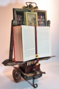 A much-used library card, a poem from The Old Farmer’s Almanac, and a replica time piece are mounted on an antique frame to which is attached a vintage brass lion drawer-pull. They sit on an old ruler and some of the inner works of a 1940s Remington typewriter. The whole assemblage moves when gently pulled. The drawer and wagon hold words made from scrabble pieces. A book mark is a typewriter ribbon circa 1940. The book is Solomon Cleaver’s 1935 Canadian classic Jean Val Jean.
