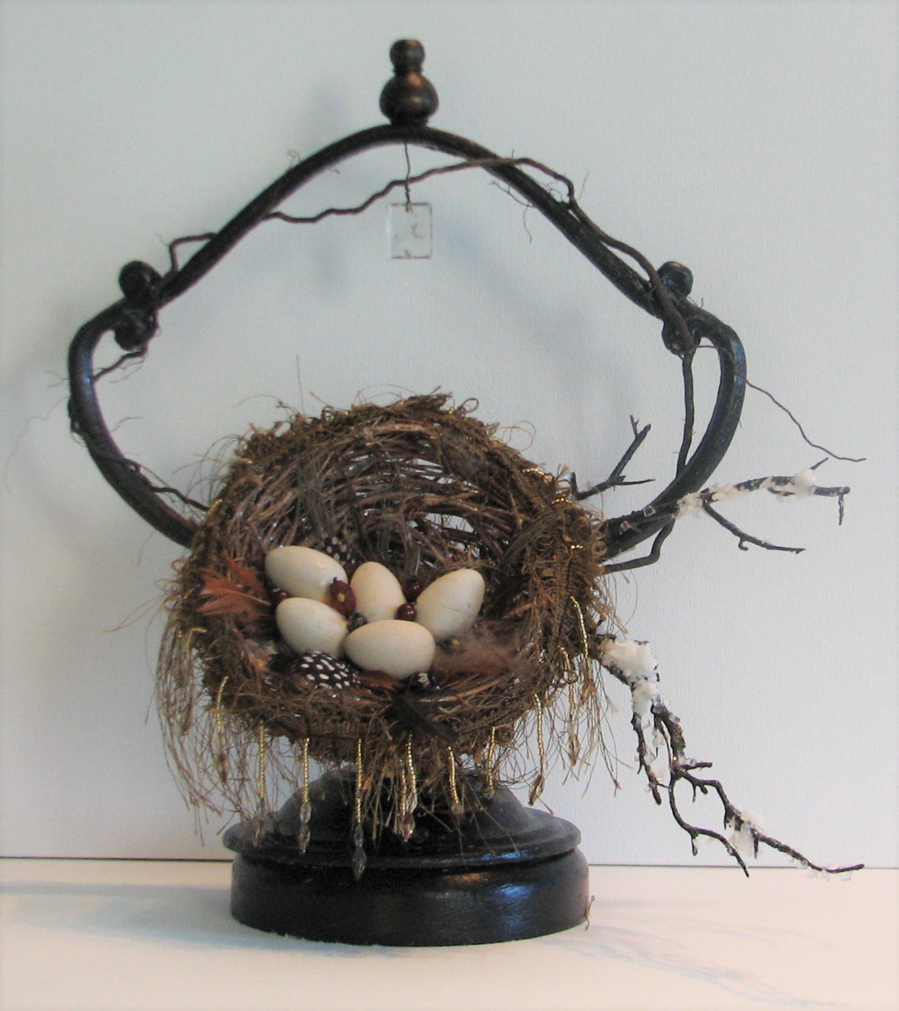 The nest in this whimsical piece is embellished with ribbon, beads and plumage and rests on small branches. The nest provides a secure dwelling place for the eggs — symbols of renewal and possibility.
