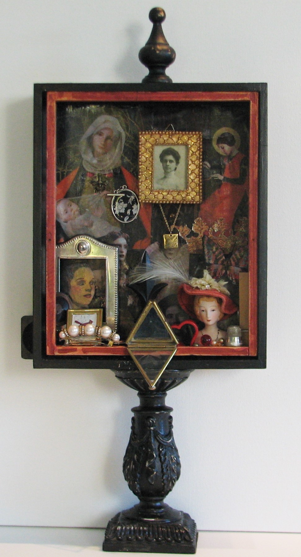 Objects of beauty and of women’s daily toil and routine converge in this assemblage. Symbols of faith, work, and adornment bid us contemplate the transformation of women’s roles over time. A glass receptacle awaits your personal treasure.