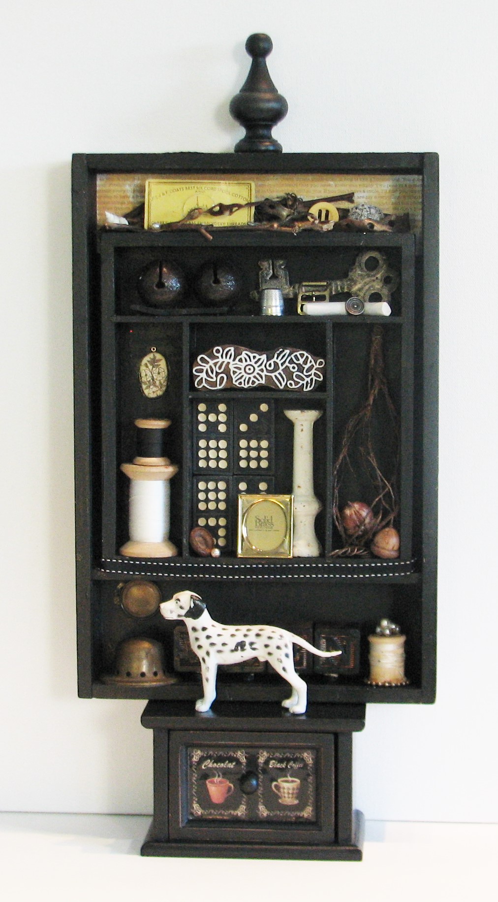 This piece is more about memories and ancestors’ times than symbolism. Dominos and antique sleigh bells nestle together with an oil lamp part, a flower printing block, and a moose antler pendant above the spools of thread. Two acorns rest at the base of a tree root and a shoe buckle is supported by a large key. Sewing notions such as wooden spools, pins, a package of sewing needles, antique button, ribbon, and a thimble are juxtaposed with natural elements. An attentive Dalmation dog oversees it all.