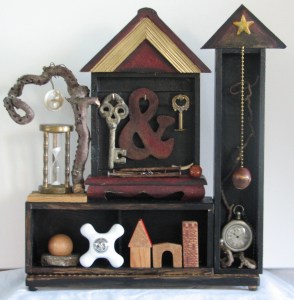 From the chips of prehistoric Yukon Mammoth tusk, to the hour glass that you are invited to turn and the gently swinging pendulum, several elements of this composition serve as reminders that time is precious. Others, such as a bolt from a Yukon sternwheeler, remind me of my years living in two very special places – Whitehorse and Watson Lake, Yukon in the 1980s. Roof tops and buildings are more generic symbols of place. Similarly, the porcelain tap, old watch, antique buttons, and old spikes and nails are generic symbols of the past.