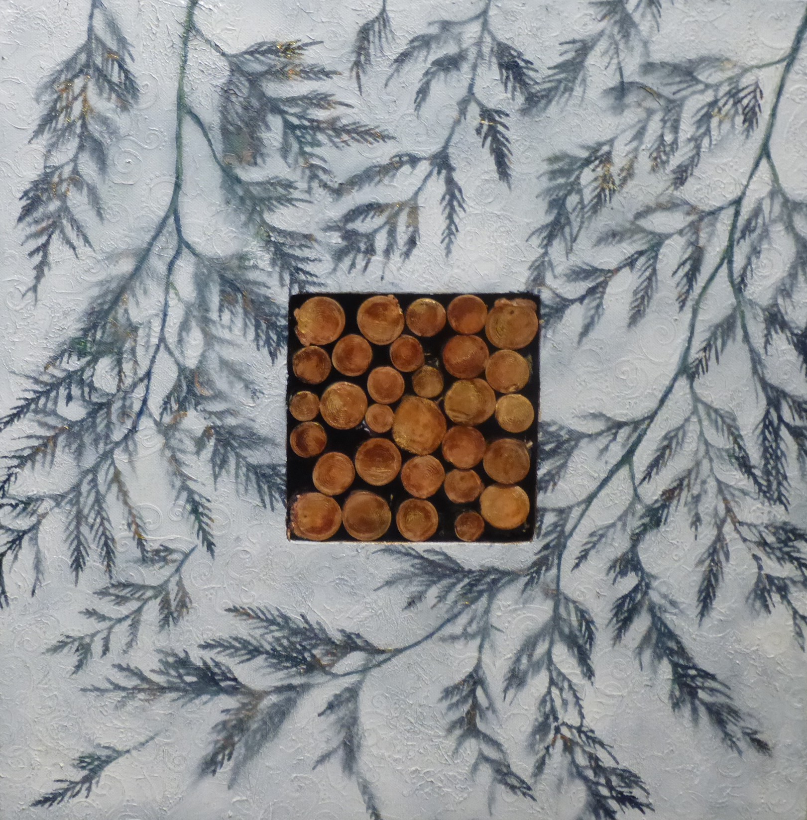 The textured background of this piece invites the viewer to think of the softness of misty days and perhaps even of snow, while the cedar greens are emblematic of coastal British Columbia. Small pieces of cedar branch form the ‘wood pile’ that fills the centre cavity. They are cut from the branch which was the model for the painting.