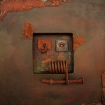 Rusty Disk. SOLD. 3-dimensional assemblage. 14″ x 21.5″ x 3.5″ (#1409).