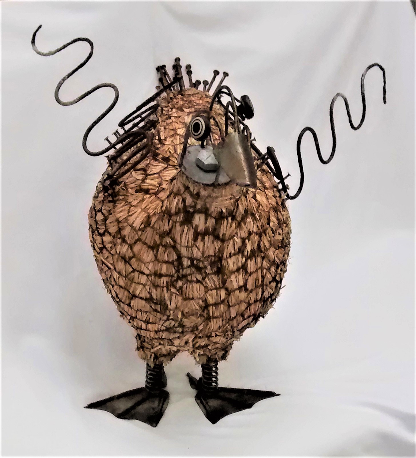 Sometimes I can’t suppress my whimsical side and it comes forth in my art. This bird is a composite of objects found in the thrift shop, in my button box, at a local construction site, and in a nearby forest.