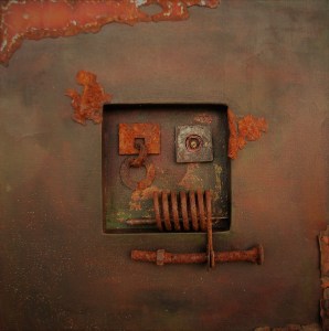 This assemblage comprises an acrylic painting on canvas, with found metal objects in the central shadow box and rusted pieces of metal attached to the perimeter. Apart from the canvas, the components of the work were found as discarded objects on a seaside walk. ‘Remnants’ is the juxtaposition of many shapes — flat, elongated, rectangular, circular, and coiled.